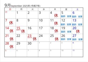 休診について 2025.08.25 2025.09.03 9月20日(土)は 休診 となります。 ご迷惑をおかけし大変申し訳ございません。 よろしくお願いいたします。 お盆の休診について 前の記事 10月22日の診察について 次の記事